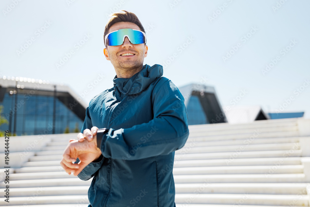Active man in blue sportswear smiles, checking his smartwatch on an urban staircase during a bright sunny day #1945444276