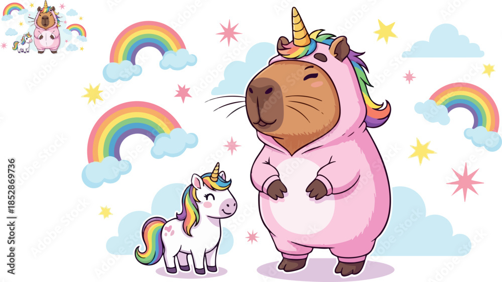 Adorable capybara wearing a unicorn costume stands happily beside a small unicorn drawing #1852869736