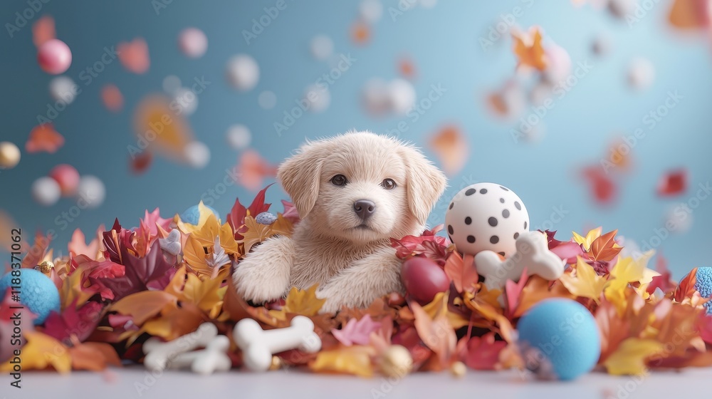 Adorable 3D Puppy Surrounded by Colorful Autumn Leaves #1188371062