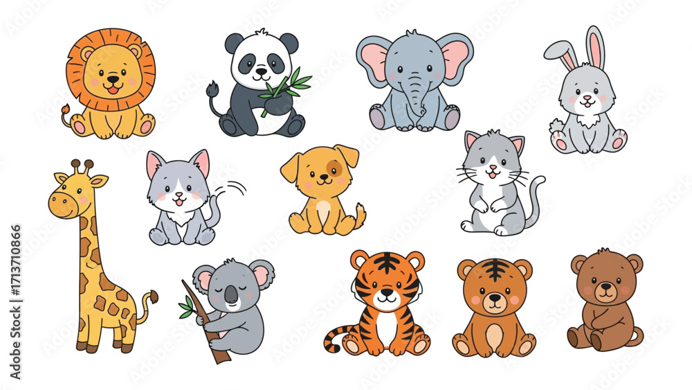 Adorable Zoo Animals: A collection of charming cartoon animals, each with its unique personality, showcasing a delightful array of cuddly creatures. #1713710866