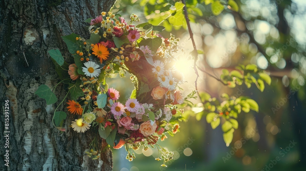 Adorning a midsummer tree in Sweden with a beautiful floral wreath #815391296