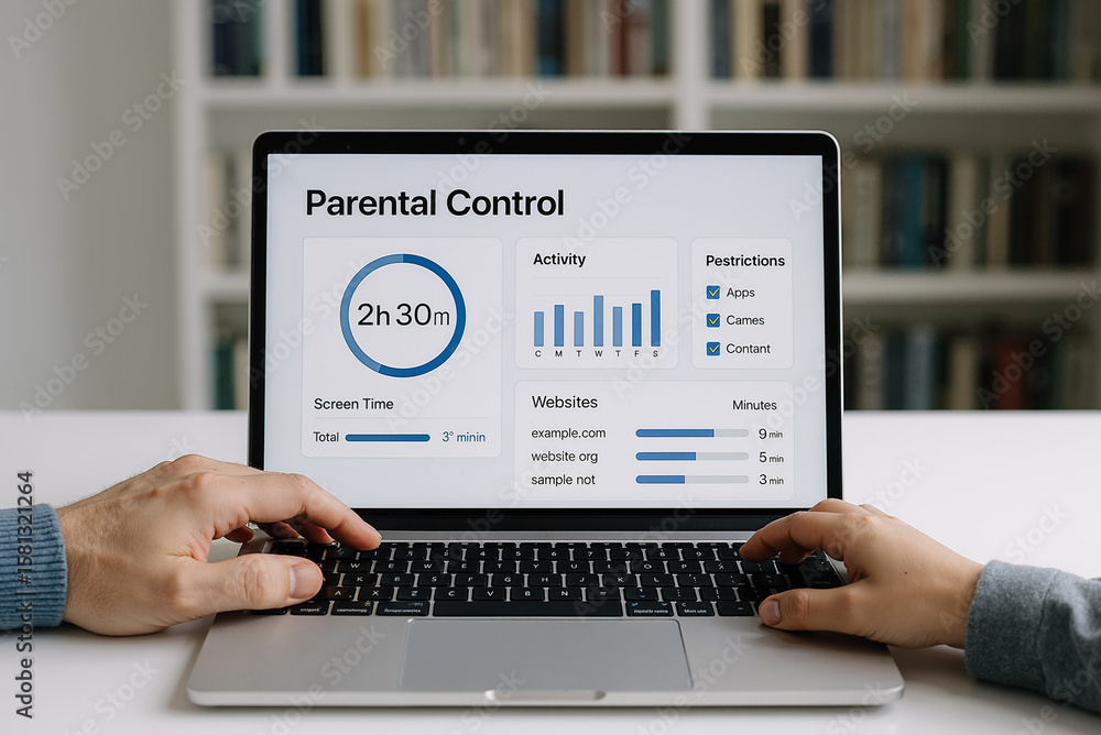 adult and child using laptop with parental control settings displayed on screen, indicating digital security and family internet safety #1581321264