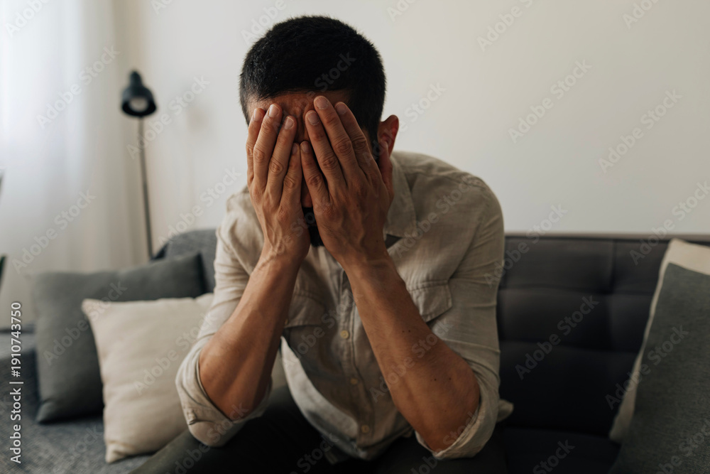 Adult man sitting on a sofa covering his face with his hands, expressing emotional distress at home. Concepts of depression, anxiety, stress and mental health. #1910743750