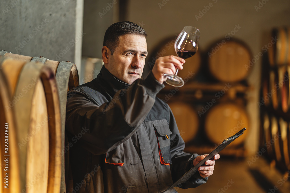 Adult man winemaker at winery checking glass looking quality while standing between the barrels in the cellar controlling wine making process - real people traditional and industry wine making concept #422442640