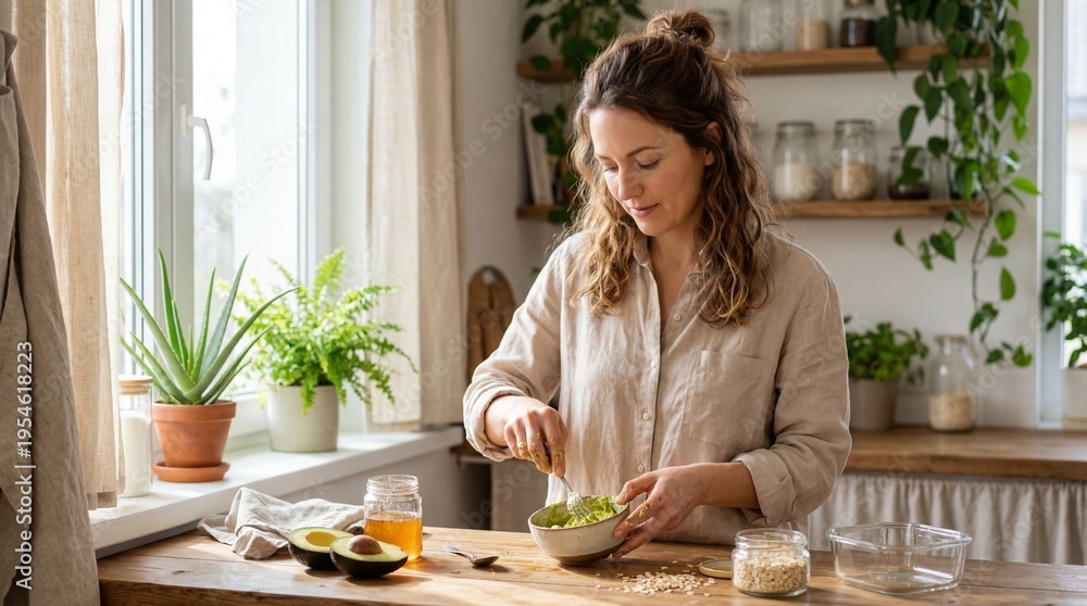 Adult woman mixing fresh green salad in a sunlit home kitchen, healthy eating and meal prep with natural ingredients for wellness lifestyle and everyday cooking #1954618223