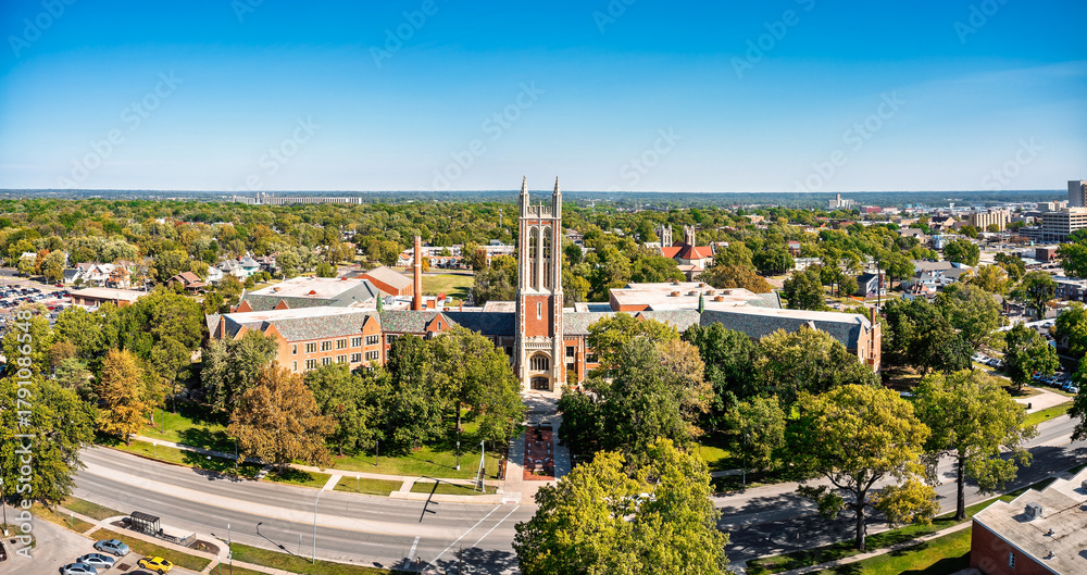 Aerial panorama of Topeka, Kansas, High School and skyline. Topeka is the capital city of the U.S. state of Kansas and the county seat of Shawnee County #1791086548