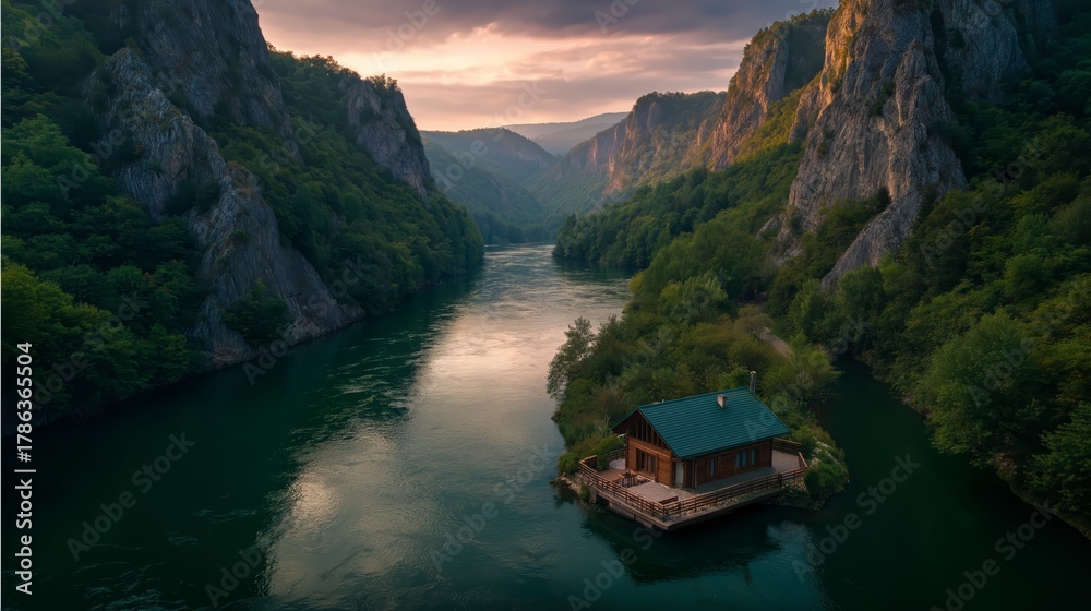 aerial view beautiful nature scenery , wooden cabin raft house on long river surround with mountain #1786365504
