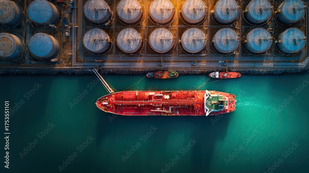 Aerial View of Red Cargo Tanker Docked at Fuel Depot with Steel Tanks #1753551101