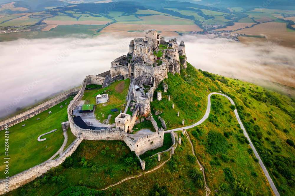 Aerial view of Spis Castle (Spissky hrad, Slovakia) on fogy summer morning #1428421569