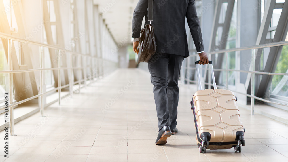 African American businessman in suit walking through airport terminal with rolling luggage. Concept of travel, business trip, mobility and global transportation #1781039253
