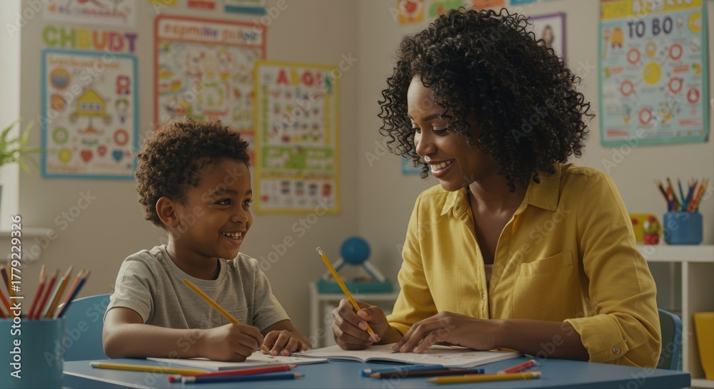 african-american woman teaching smiling young boy art lessons in colorful classroom setting #1779229326