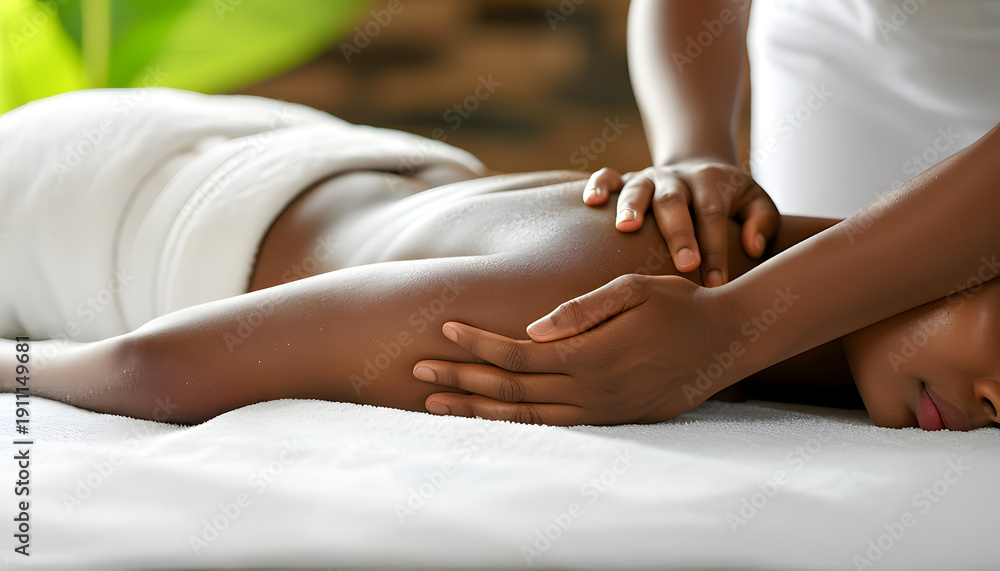 African female massage therapist performing a relaxing massage on a woman in a spa setting with soft lighting and green plants in the background #1911149681
