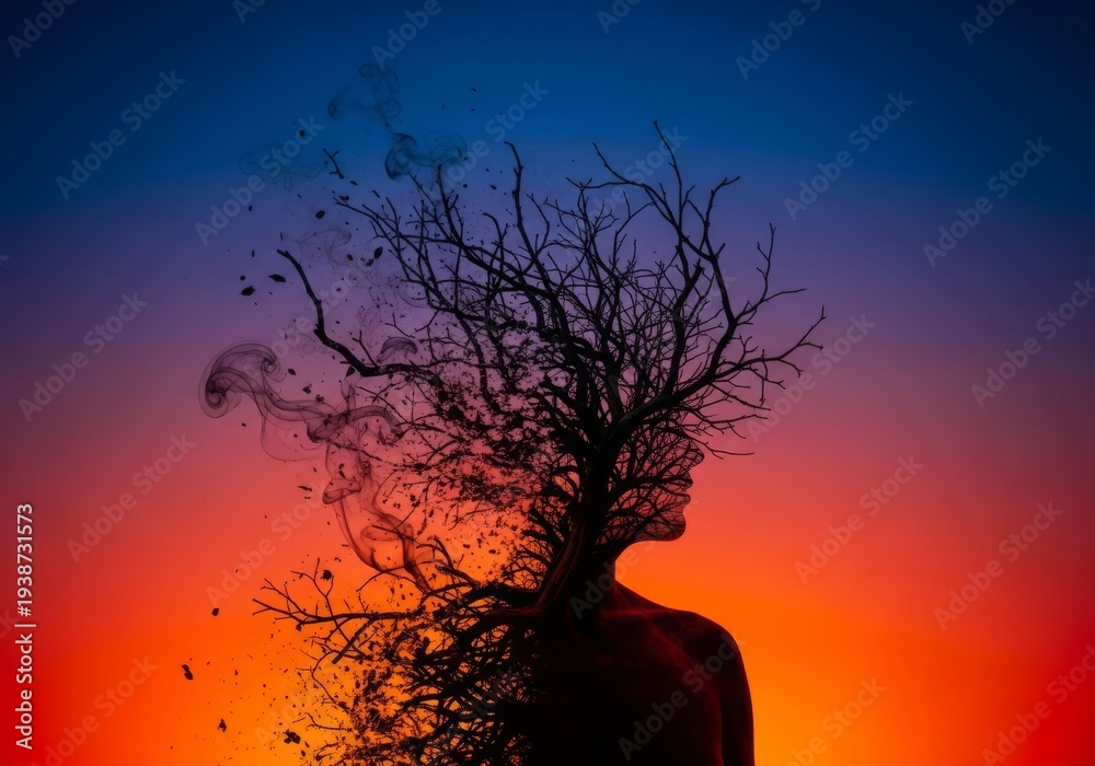 Aged silhouette dissolving into smoky, twisted branches of a conceptual tree, symbolizing profound mental struggle, stress, and emotional turmoil, gray, problem, solitude #1938731573