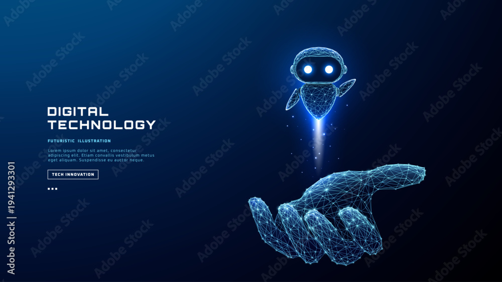 AI chatbot hologram floating above human hand. Cute robot assistant with friendly face represents digital support technology and futuristic communication concept. Polygonal blue vector illustration. #1941293301
