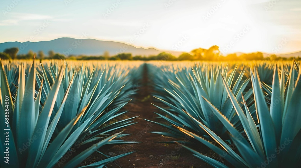 AI generated illustration of a sunset casts a beautiful glow on a field of blue agave plant #688584607