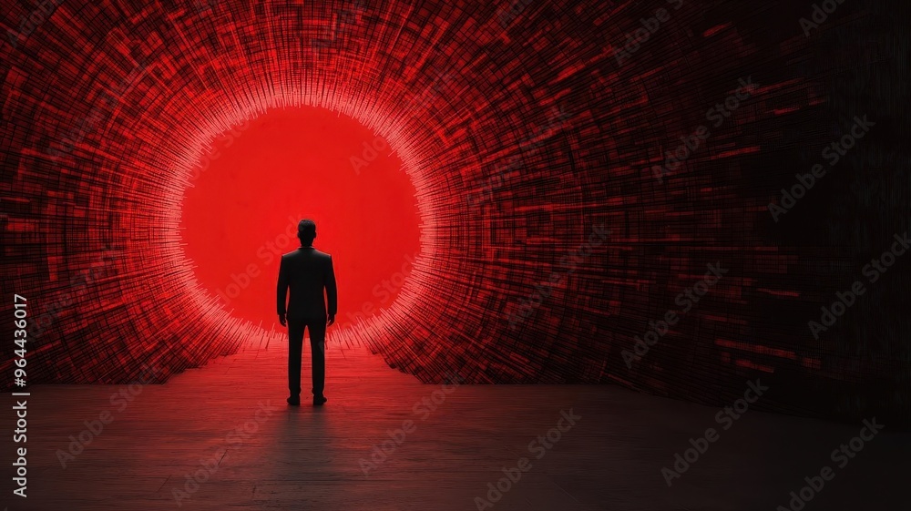 AI guardian figure standing in front of a massive digital gate, blocking a stream of red malicious code, representing ultimate cyber defense #964436017