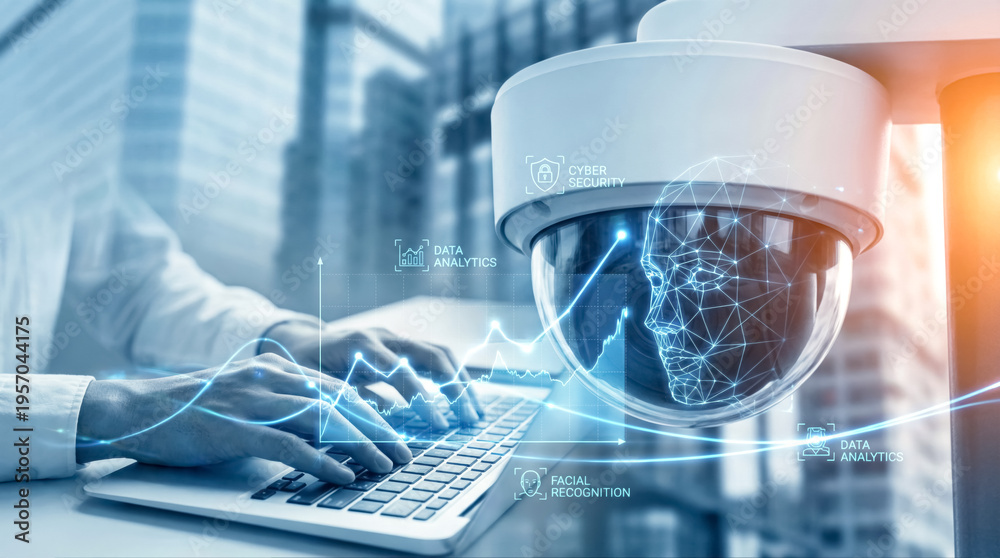 AI security camera with facial recognition, cyber security and data analytics icons on laptop screen. #1957044175