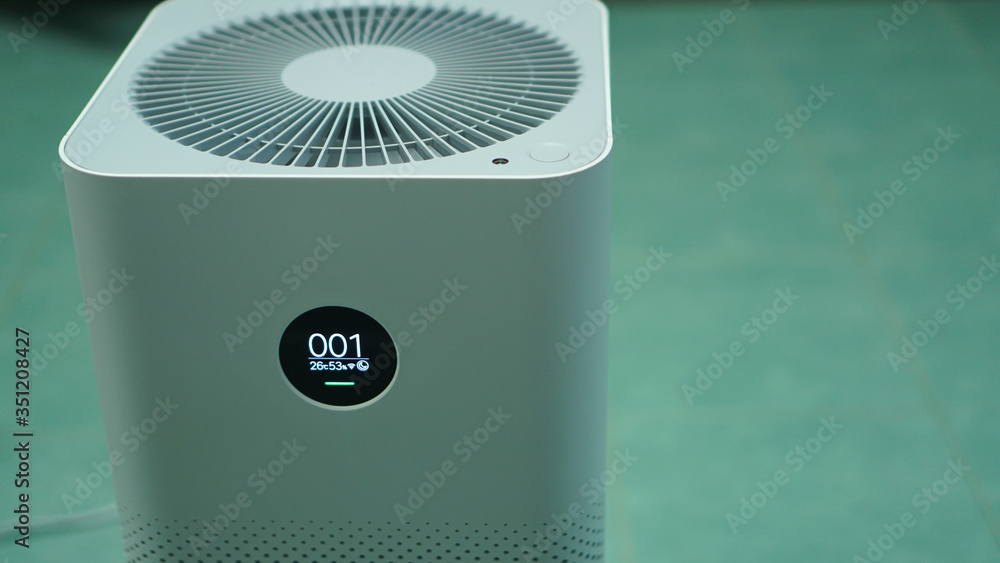 air purifier machine. on the bed room at home, free space.increase in air humidity indoors, comfortable living conditions, Preventing allergies. PM 2.5 Dust value is 1 #351208427