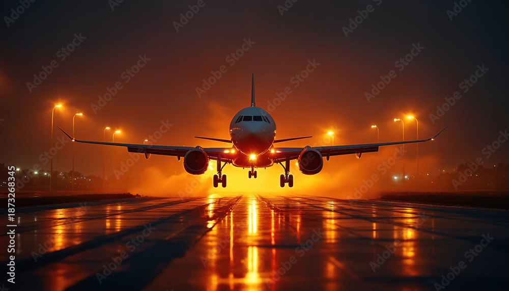 Aircraft at night on the runway. Airplane taking off during the golden hour in the dark. Plane illuminated with lights. Evening flight on the aerodrome. Transportation and travel concept. #1873268345