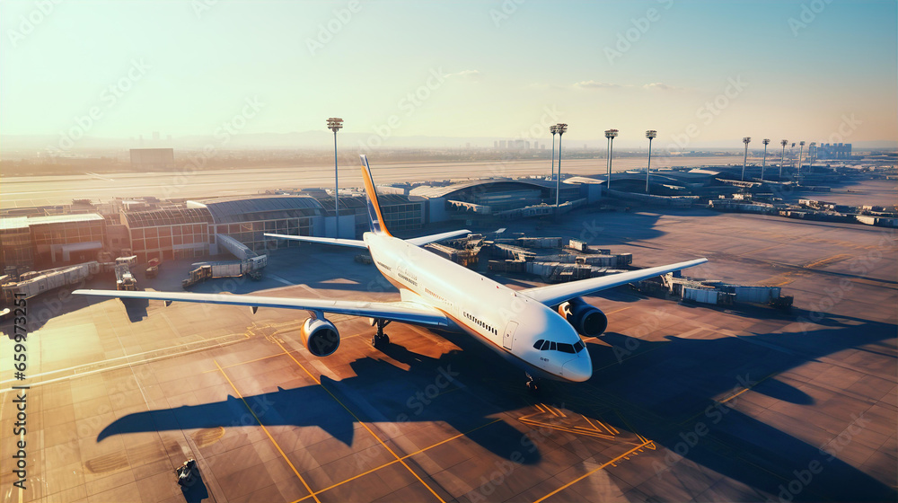 Airplane loading luggage and cargo in airport at sunset, operations In Airport, travel and transportation idea #659973251