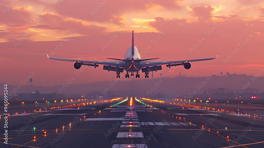 Airplane take off from runway airport during sunset, rear view from the end of the runway. #965095244