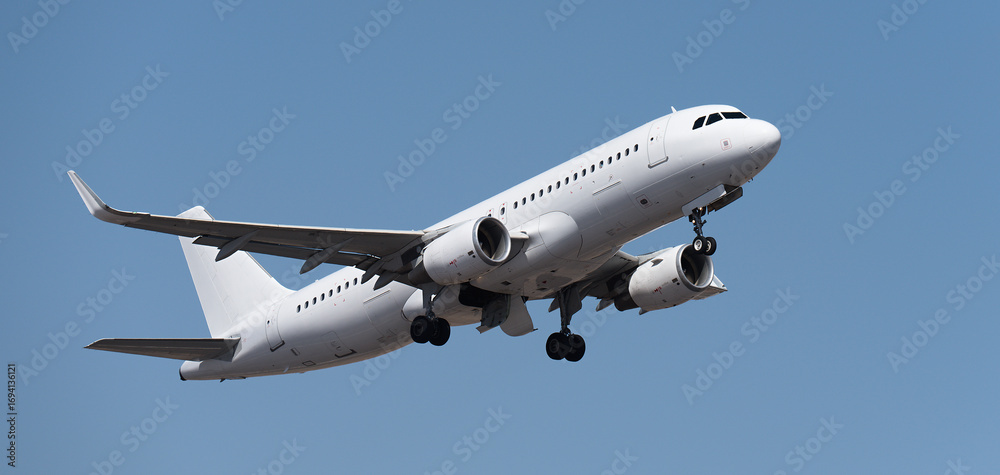 Airplane take off on the blue sky, Aircraft flying on sky background. White passenger jet plane in the blue sky. Low angle view of Airplane flying under blue sky #1694136121