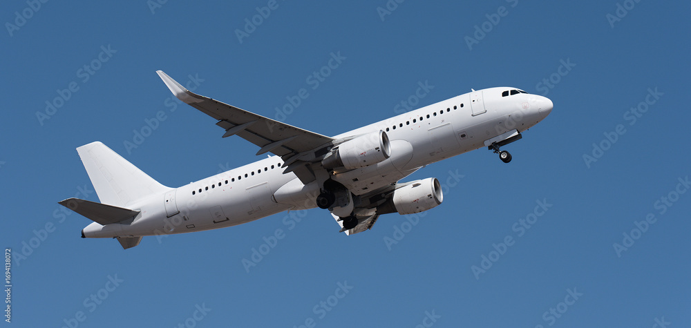Airplane take off on the blue sky, Aircraft flying on sky background. White passenger jet plane in the blue sky. Low angle view of Airplane flying under blue sky #1694138072