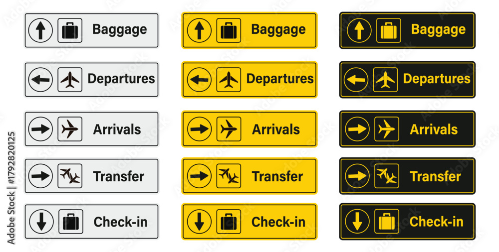 Airport sign vector with arrivals, departures, baggage claim, and transfer directions, information board signs for airport navigation, check-in and travel guidance panel. #1792820125