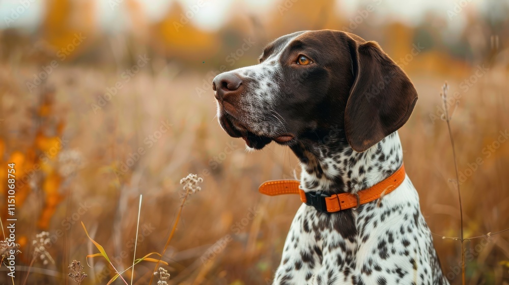 Alert hunting dog with spotted coat and orange collar looking into distance across golden autumn field during evening light #1151068754