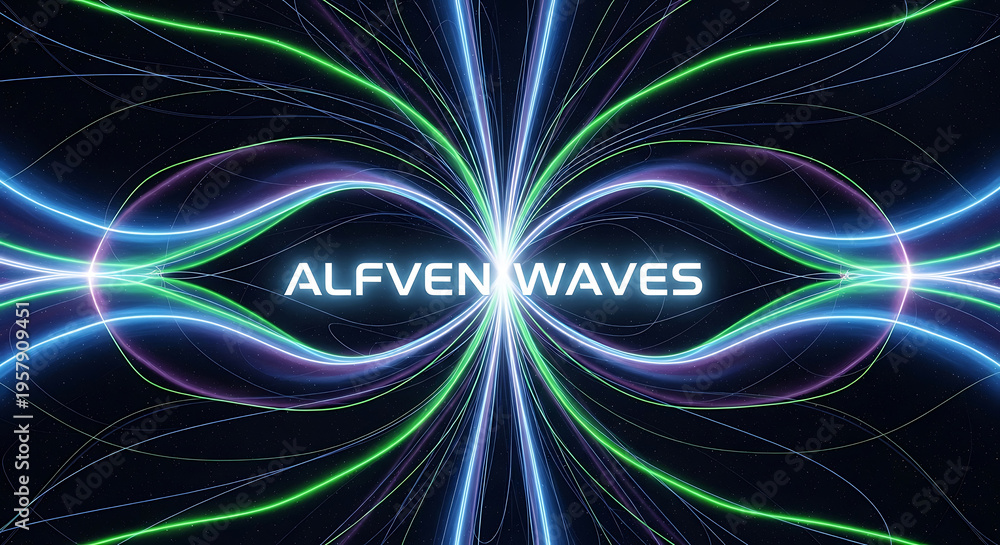 Alfven waves concept with glowing colorful neon lines on dark background representing plasma physics and magnetic field phenomenon #1957909451