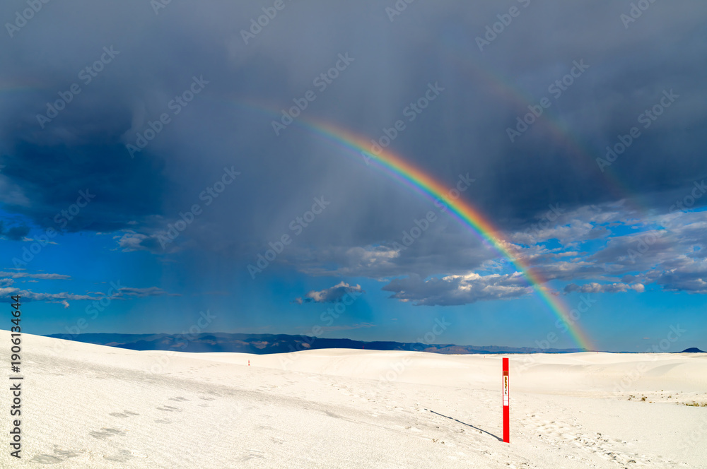 Alkali Flat Trail in White Sands National Park, New Mexico. Scenic view features a vivid rainbow over white gypsum dunes and a red trail marker under a stormy sky #1906134644