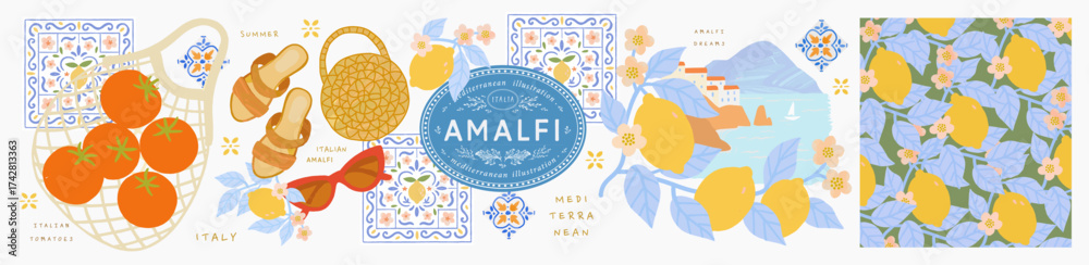 Amalfi. Vector summer mediterranean illustrations of italian coast, lemons, pattern, tomato in wicker string bag, tile, ceramics, sandals with bag and sunglasses for postcard, poster or background #1742813363
