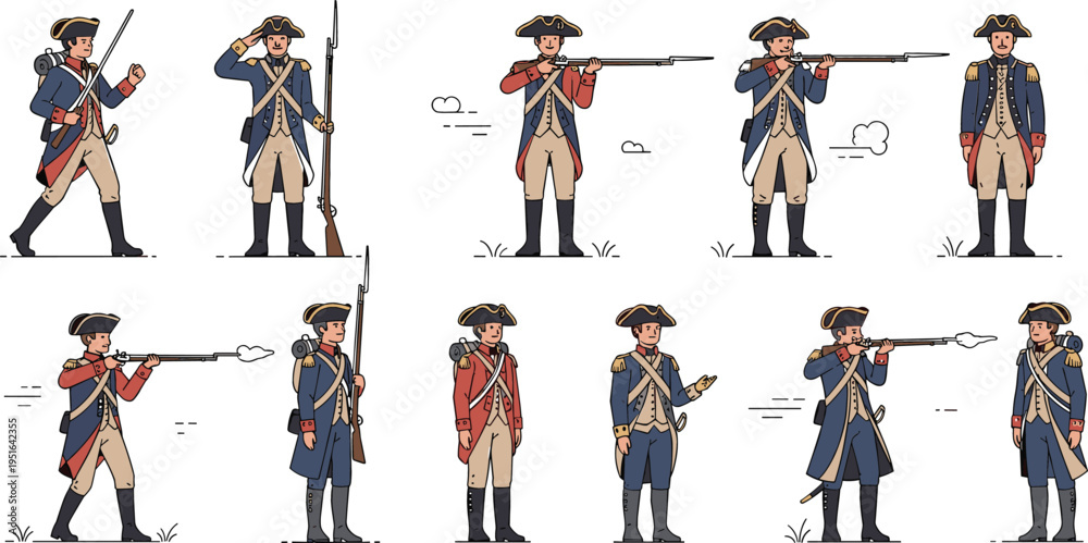 American revolutionary soldiers vector illustration set with colonial army uniforms, muskets and historical characters, USA independence war collection design #1951642355
