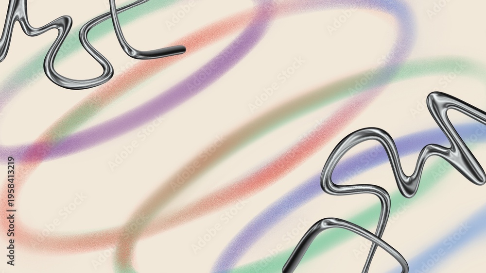 An abstract composition with soft multicolored lines and chrome wavy elements on a light background. The light and airy design features an airbrush effect and gradients. #1958413219
