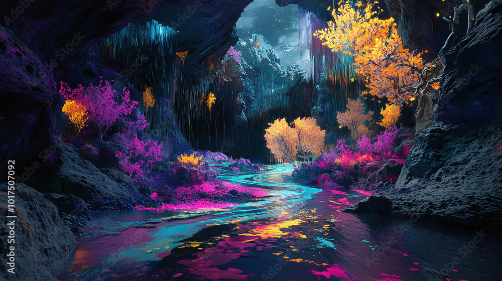 An abstract, dreamlike landscape with fluid, flowing lines and bold splashes of neon colors, creating the illusion of a nature scene from a different realm. #1017507092