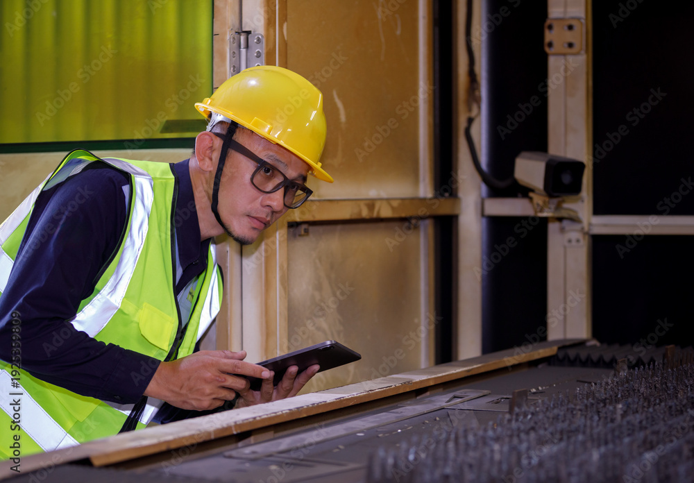 An adult Asian male, an industrial technician, wearing a helmet and safety vest, uses a tablet to inspect machinery. #1925359809