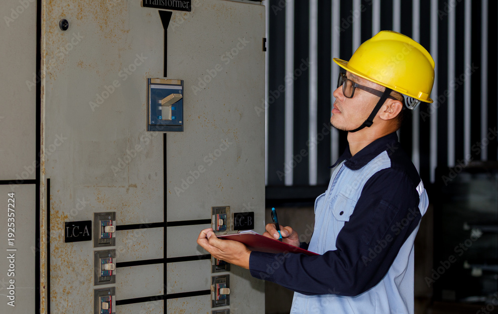 An adult male electrician, wearing a safety helmet and work clothes, is inspecting a transformer switchboard in a factory. #1925357224