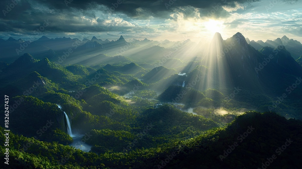 An aerial view of a vast, verdant mountain range with dramatic sunbeams piercing through the clouds and illuminating waterfalls and mist-filled valleys. #1826247437