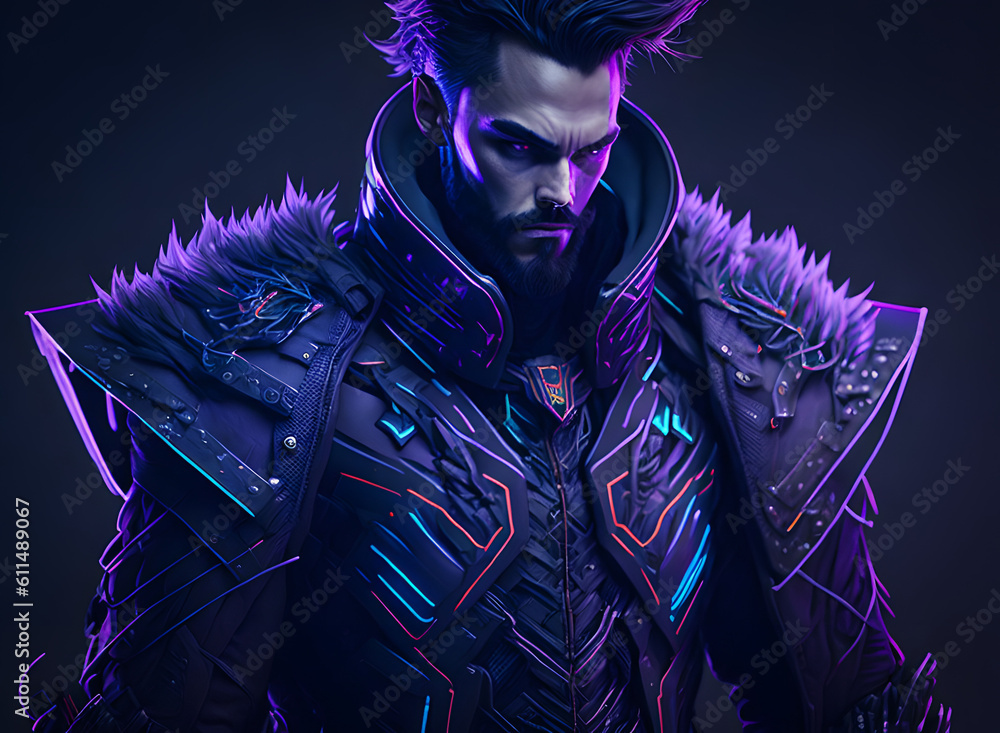 An appealing man in futuristic garb is depicted in a cyberpunk painting. Generative AI. #611489067