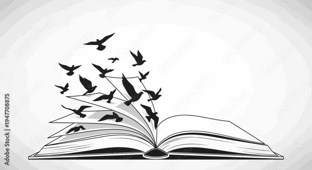 An artistic illustration of an open book with birds taking flight from its pages, symbolizing the profound freedom of knowledge, the liberation of imagination, and the power of ideas #1947708875