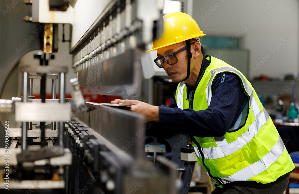 An Asian male industrial engineer, wearing a helmet and safety vest, uses a laptop to monitor the control systems of factory production machinery. #1970053226