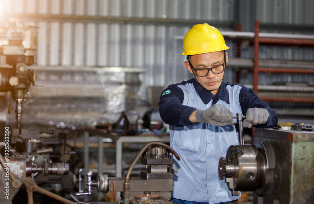 An Asian man, an industrial machinist, is operating a lathe in a factory to perform mechanical maintenance and manufacture high-precision parts. #1925362350