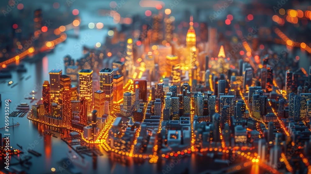 An electrified city model at night, showcasing a sprawling urban landscape with radiant street lights and illuminated buildings, reminiscent of a bustling metropolis. #769935260