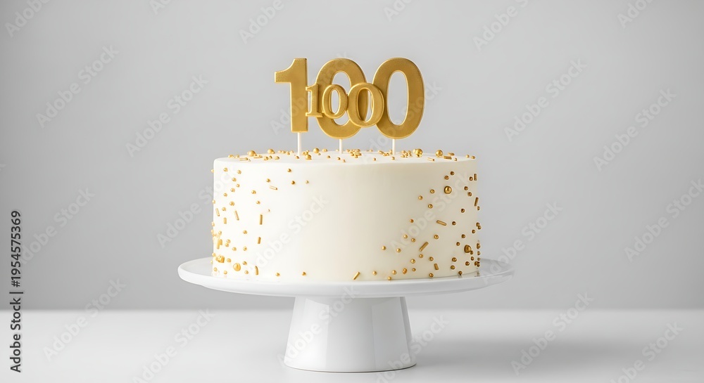 An elegant white centennial cake featuring metallic gold 100 toppers and matching side numbers on a modern cake stand. #1954575369