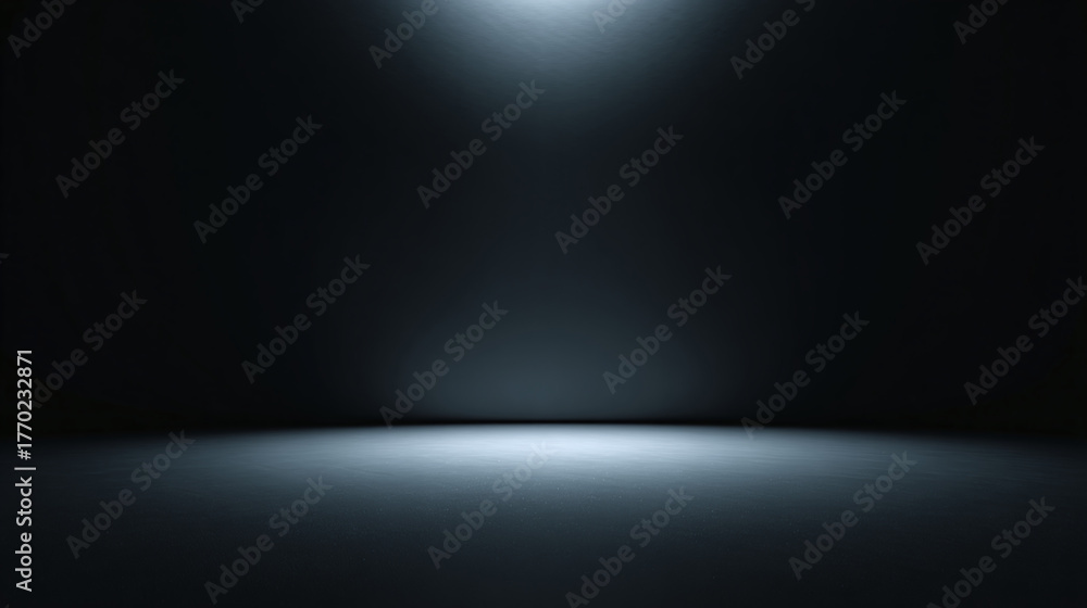 An empty dark room with a spotlight illuminating the floor. The image shows a dimly lit space with a strong contrast between light and shadow #1770232871