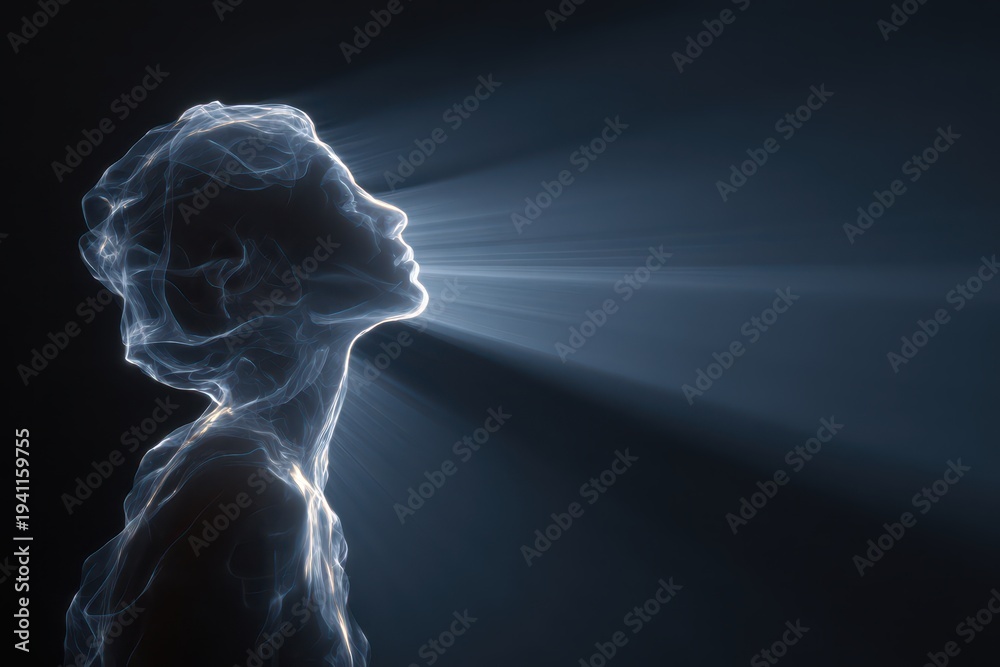 An ethereal and luminous profile of a human face emerges from profound darkness, illuminated by shafts of mystical light. #1941159755