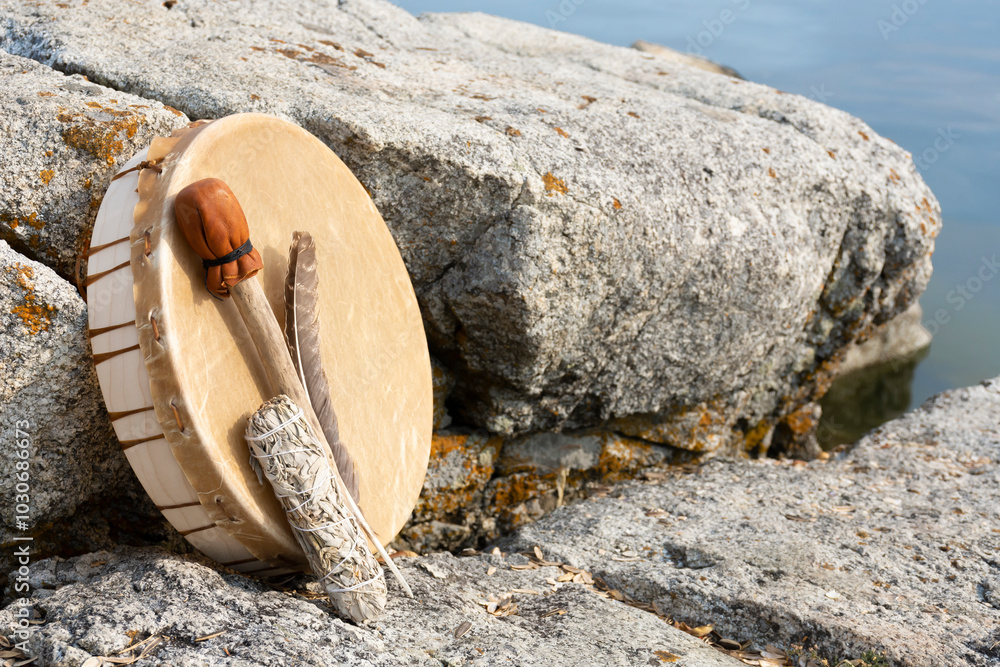 An image of a hand made leather meditation drum leaning on a rock face with sacred feather and sage smudge stick. #1030686673