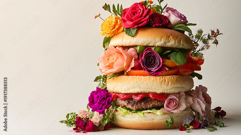 An imaginative burger filled with colorful roses and foliage #1917388513