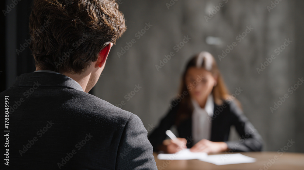 An interview in progress, with the back of a man facing the viewer and a woman taking notes #1788049991
