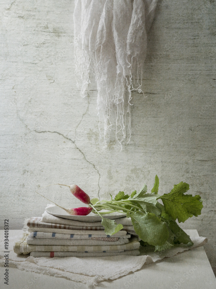An ironic still life with radishes on a light background #1934015372